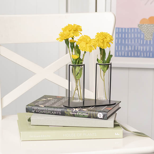 Crafted with precision, the sturdy metal frame provides a stable and elegant structure, while the clear glass tubes create a stunning visual contrast. The open design allows for easy access, making it simple to change water or swap out flowers as needed. Whether placed on a tabletop, shelf, windowsill, or as a low-lying centrepiece on a dinner table, this piece effortlessly blends into contemporary, industrial, or minimalistic interiors.