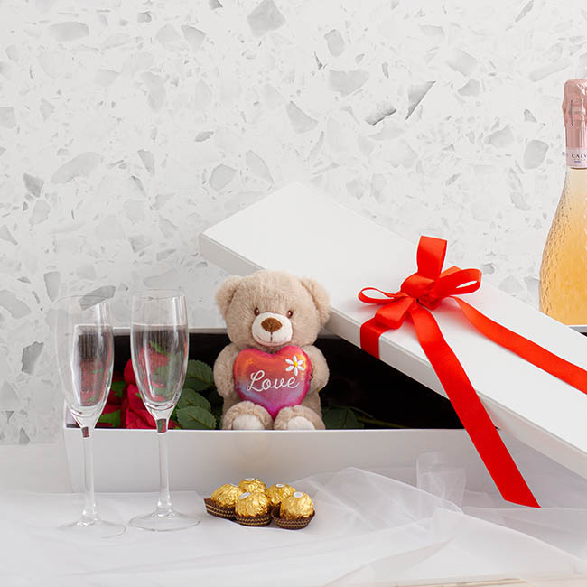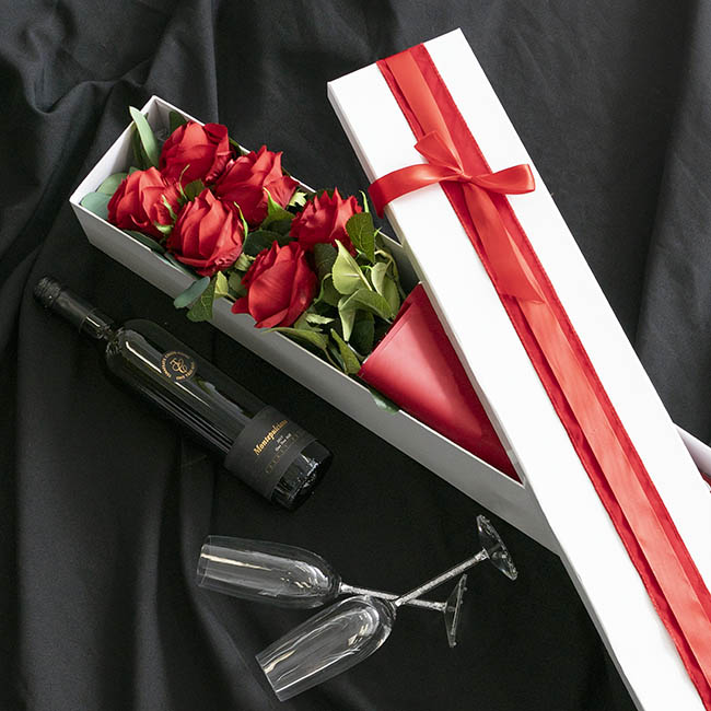 In addition to the roses, there is enough room to also include a small box of chocolates, jewellery box, wine or teddy bear. This box is particularly well-suited to special occasions like Valentine's Day, Mother's Day, Engagements, and Weddings.
