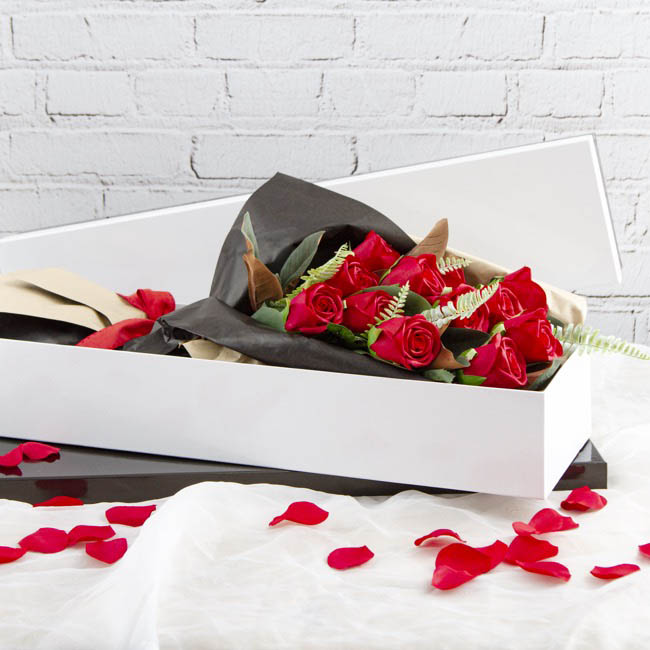 Each box can accomodate 12 individual roses and a small teddy bear, bottle of wine, chocolates or other small gifts like jewellery.