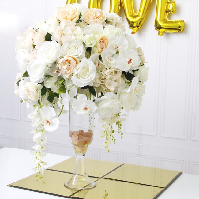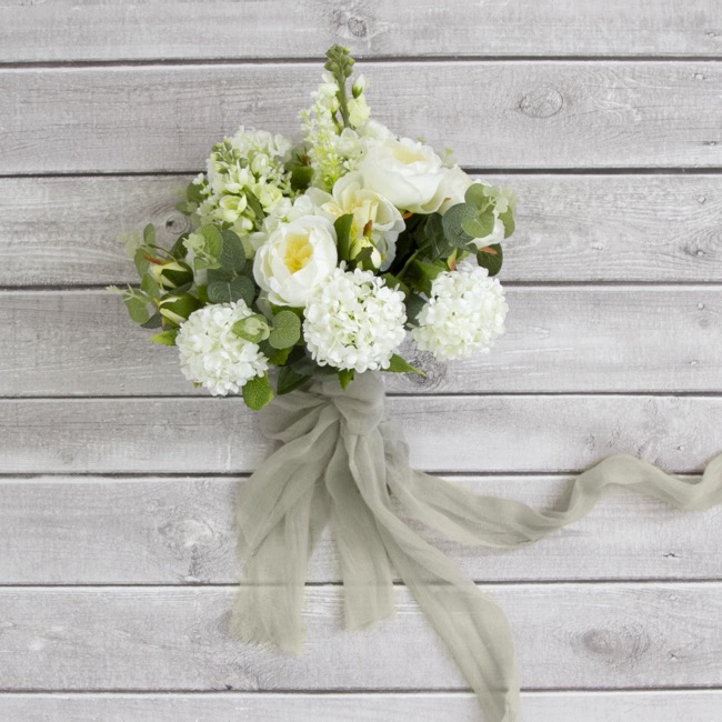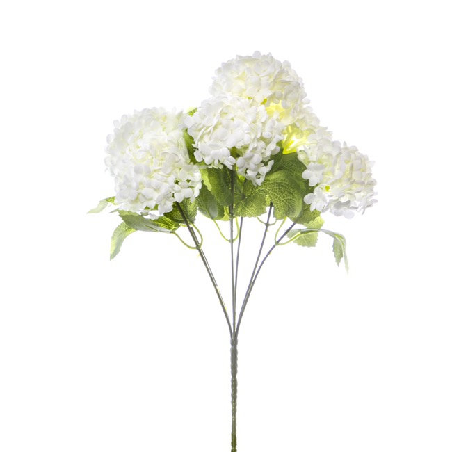 This is a popular bunch, with hydrangea-like large rounded heads of white flowers that resemble snowballs.The maple-like leaves add colour to the bunch. It has a 30cm tall stem with 7 flower snowball heads.