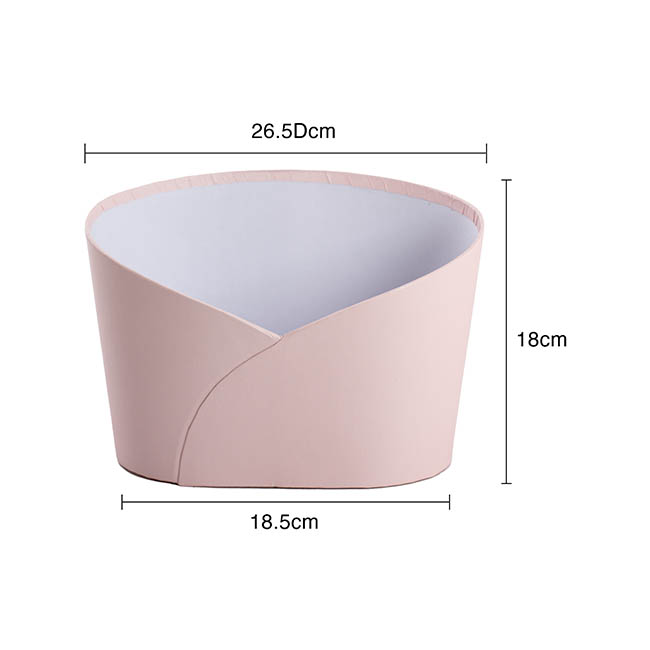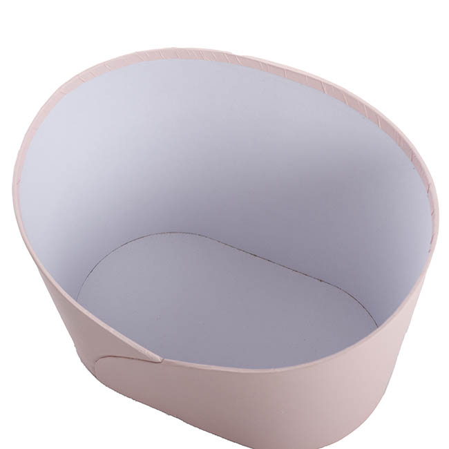Such an elegant way to present your gift hamper with this medium baby pink oval shape bucket. It has a low front, perfect to display and showcase what's inside. Made from rigid matte cardboard and measuring 26.5cm wide, 18.5cm in depth, 18cm in height and 10.5cm in height in the front middle point.