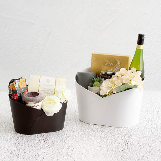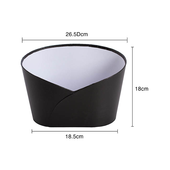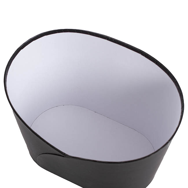 Such an elegant way to present your gift hamper with this medium black oval shape bucket. It has a low front, perfect to display and showcase what's inside. Made from rigid matte cardboard and measuring 26.5cm wide, 18.5cm in depth, 18cm in height and 10.5cm in height in the front middle point.