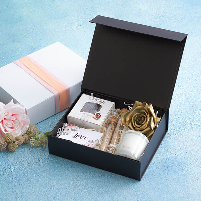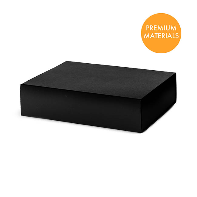 This Medium Hamper Gift Box with Magnetic closure Flap in Black is a robust and premium-looking Hamper Box that neatly contains your hamper gift contents. Easy to assemble and ship, these sturdy Hamper boxes can be used for Christmas or holiday hampers, birthday presents, baby shower gifts, bridesmaid/groomsmen gifts, and more.