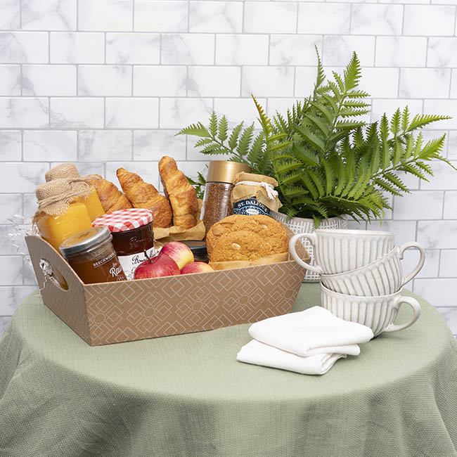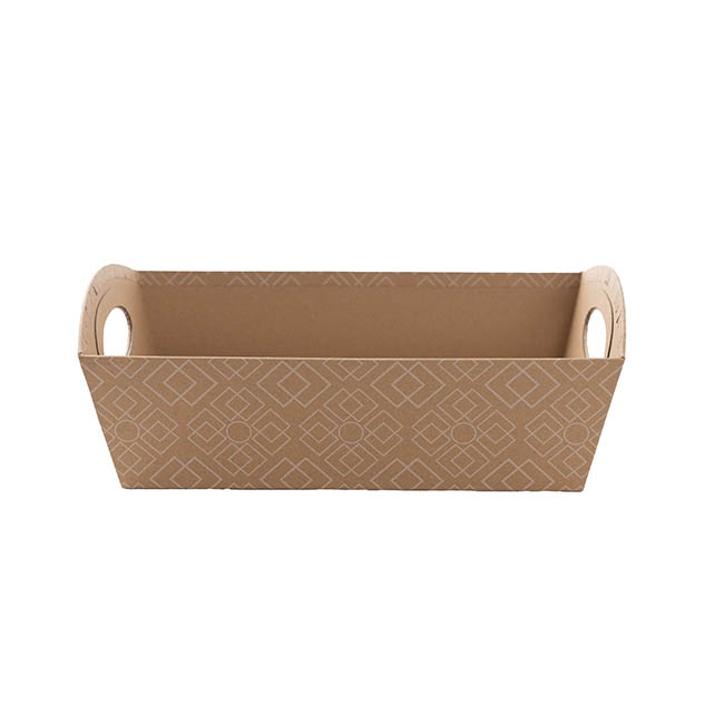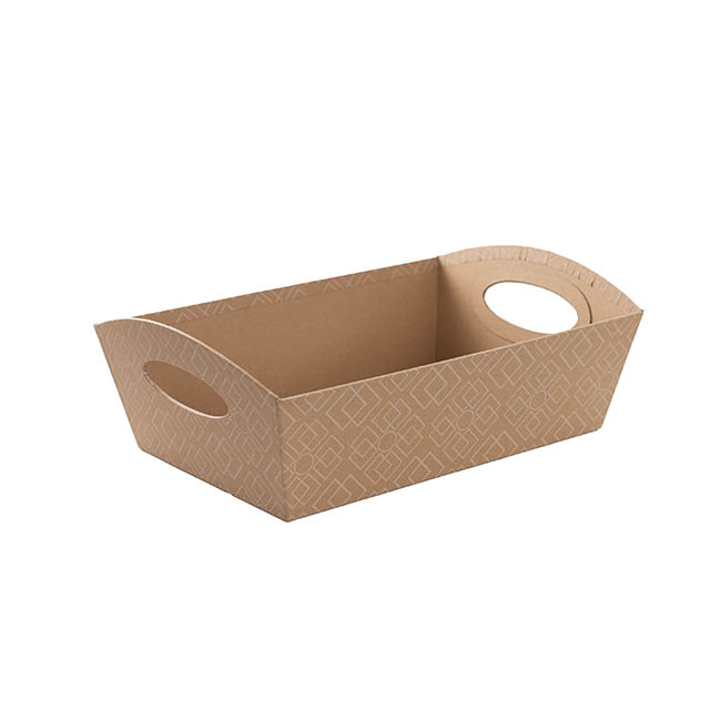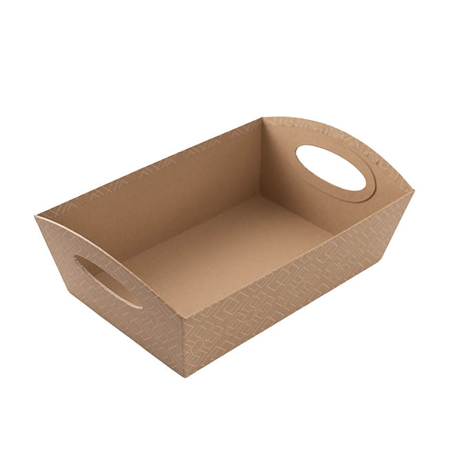 Made of rigid kraft brown cardboard, complete with handles, and decorated with a white lattice pattern, this hamper tray provides a functional, reusable, and versatile gift packaging solution.