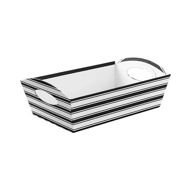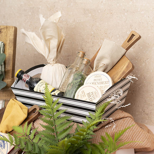 Made of rigid white cardboard, complete with handles, and decorated with a black and white double stripe combo, this hamper tray provides a functional, reusable, and versatile gift packaging solution.
