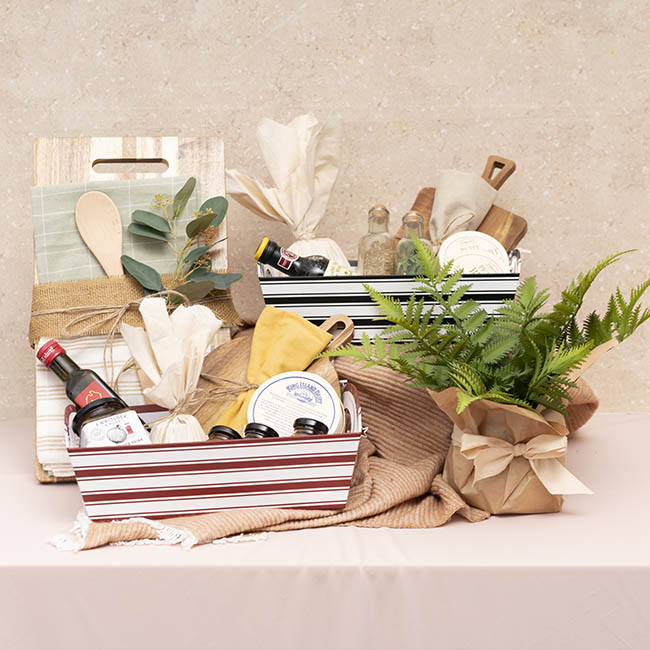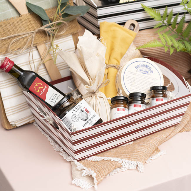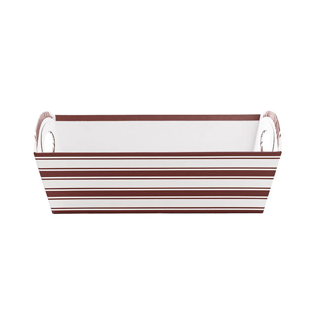 Made of rigid white cardboard, complete with handles, and decorated with a dark red and white double stripe combo, this hamper tray provides a functional, reusable, and versatile gift packaging solution.