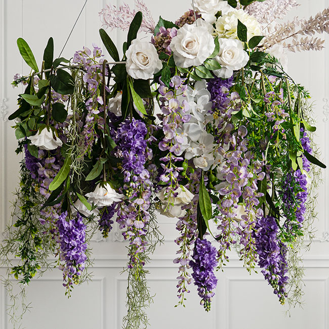 If using wet bricks, factor in weight of saturated floral foam bricks, which has an average of just over 2kg per wet brick. If using SKU: 6628 floral foam garlands, each soaked link weighs up to 1kg. If using either of these mechanics to hydrate flowers, take care to not exceed the weight limit of the chandelier and verify with your venue that the structure from which its being hung can withstand the weight safely.