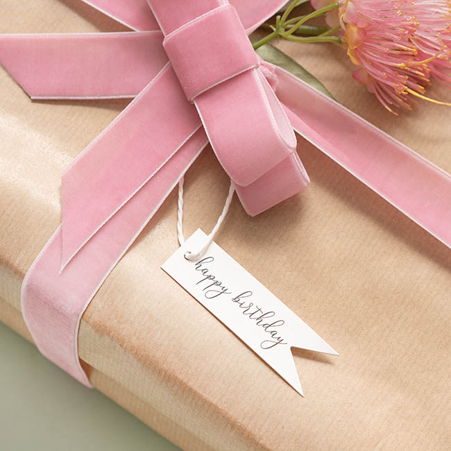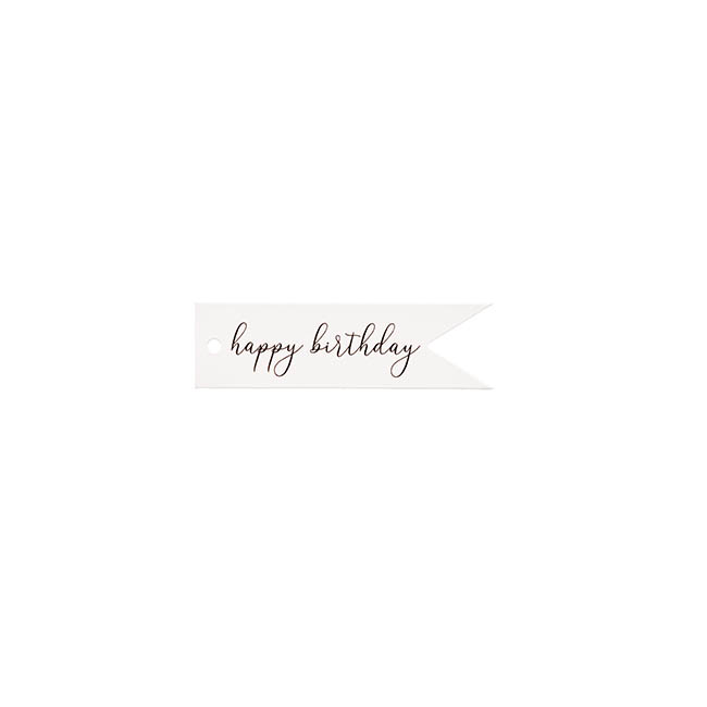These white flag-shaped Hanging Gift Tags feature a 'Happy Birthday' print in black. Use these tags as a perfect addition to small flower bouquets, gifts, sweet treats or mini hampers. The printed message is on the front, leaving room on the back for a short message.