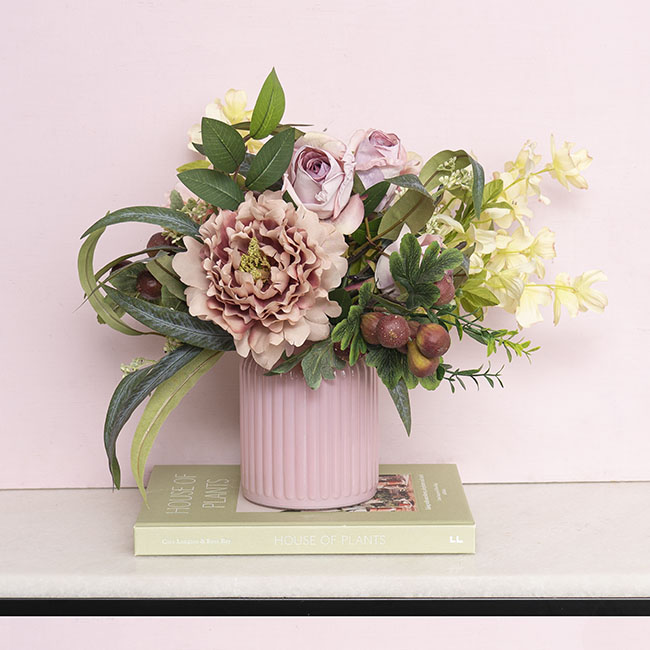 Our Medium Hurricane Glass Jar in opaque Pink is a glossy piece with a ribbed finish. This is a versatile piece for retail, events, and home decor applications.