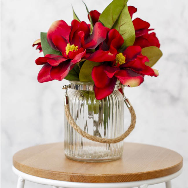 A hurricane glass jar with a ribbed line glass finish. This is suitable for candle decoration, and flower arrangements. The handle rim is a key feature with its chrome finish and jute rope handle. It measures 14cm high and has a 11cm diameter opening. It suits candles less than 7cm diameter.