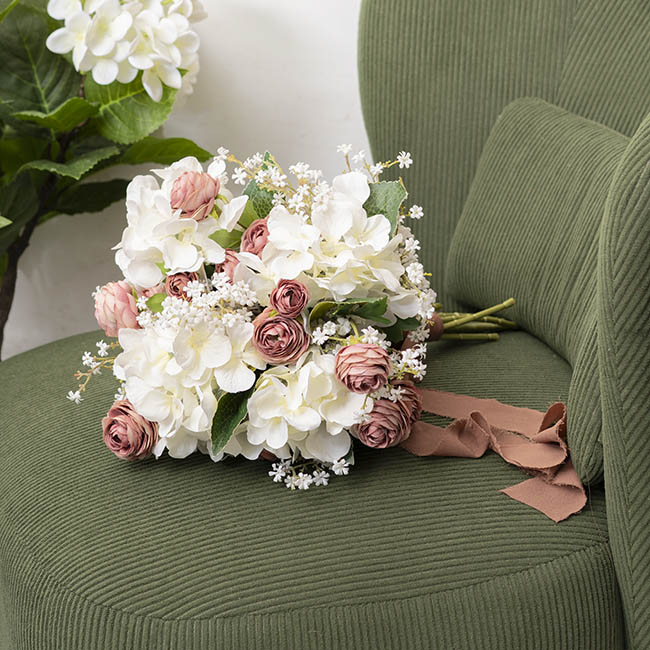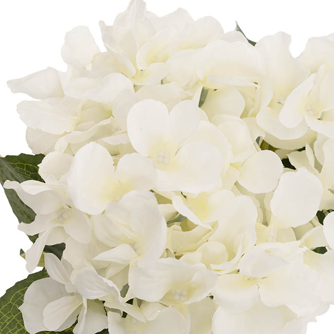 This hydrangea measures 49cm tall and 26cm in diameter. Each of the smaller flower heads that make up the flower measures 10-12cm in diameter. This product is sold individually.