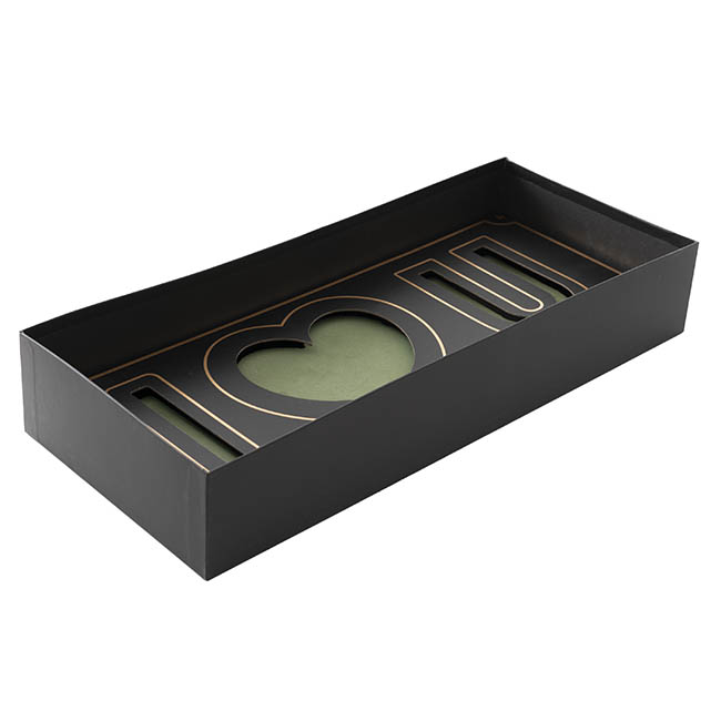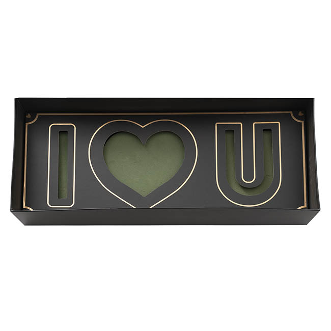 It features a black base, a black and gold cut-out insert, a black lid, and a clear tray with foam. The base includes a plastic tray that holds floral foam, topped with a cardboard insert featuring the "I Heart U" cut-out and gold, decorative trim. The insert is adorned with a gold border for an extra touch of elegance.