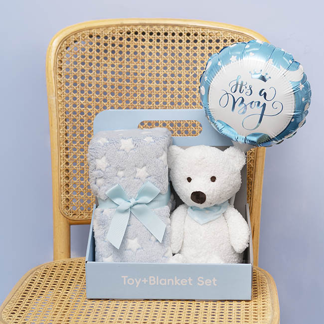 The teddy bear measures 23cm tall when seated. The plush blanket measures 90cm x 75cm. This gift set is sold individually.