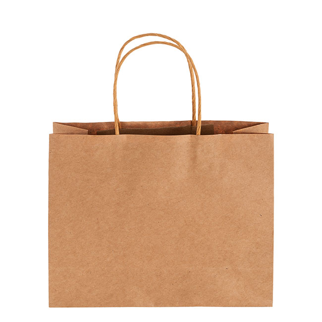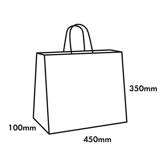 Available in a pack of 10, each bag measures 120gsm thick, can bear up to 14kg, features twist handles, and a flat base for easy packing. Also available in white and a range of sizes, this bag measures 350mm tall, 450mm wide, and 100mm deep in the gusset