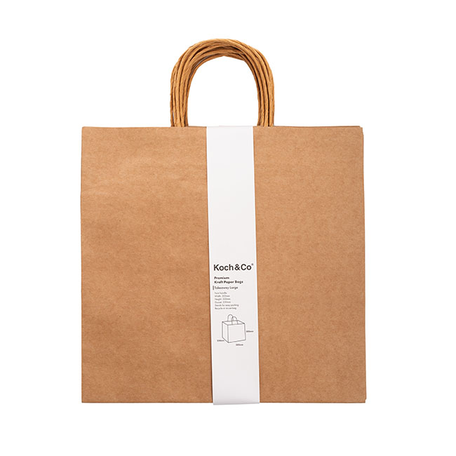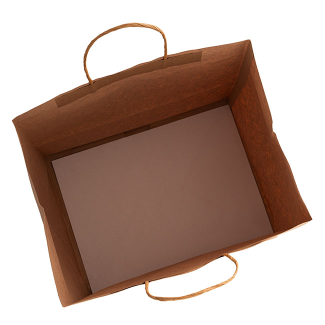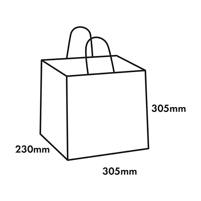 Flat-based, it sits upright on a counter for easy packing of goods. Perfect for food takeaway, it features tight-twist paper handles.