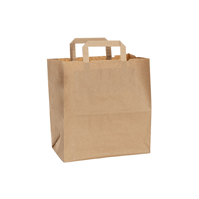 Large Brown Kraft Paper Bag features flat paper sturdy handle. Made from 70gsm kraft paper which has high elasticity and high tear resistance, designed for packaging products with high demands for strength and durability. Sits up on counter for easy packing. Can hold up to 10kg. Available in a pack of 10.