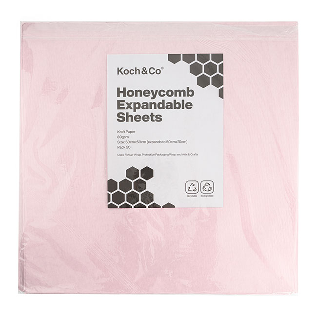 Each sheet is 80gsm and measures 50cm x 50cm and expands to 50cm x 60-70cm at maximum extension. Once expanded, this honeycomb wrap measures approximately 4mm thick. Available in a pack of 50 sheets, honeycomb or honey comb wrap is also known as Hex wrap.