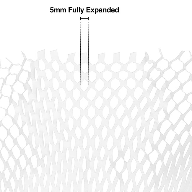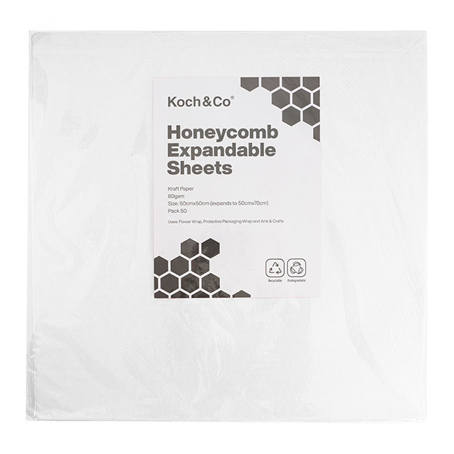 Each sheet is 80gsm and measures 50cm x 50cm and expands to 50cm x 60-70cm at maximum extension. Once expanded, this honeycomb wrap measures approximately 4mm thick. Available in a pack of 50 sheets, honeycomb or honey comb wrap is also known as Hex wrap.