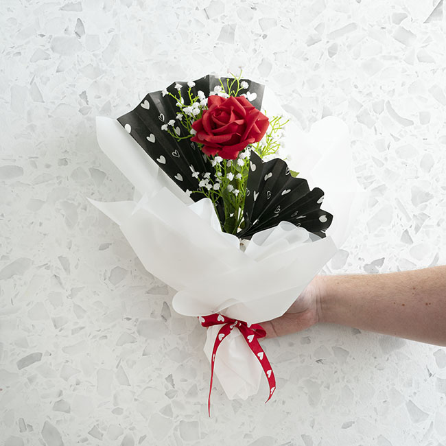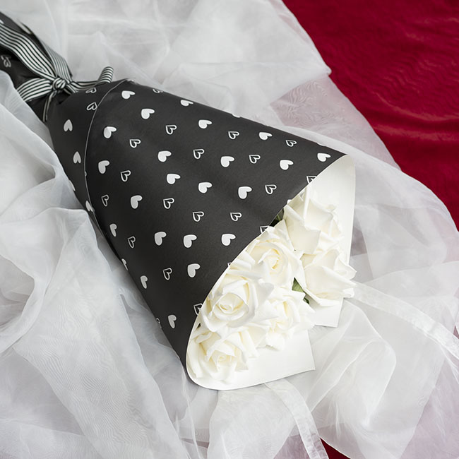 In lush black on the front with white heart print it's back is a crisp white which is sure to give your bouquets and hamper or gifts a lovely finish this Valentine's Day.