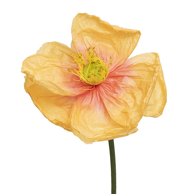 This striking giant poppy stem in apricot orange adds bold, whimsical beauty to any display. Standing 115cm tall with a generous 25cm flower head, it features delicate tissue-paper petals supported by underwire, allowing you to shape and style them as desired. Please note, the flower is very fragile and should be handled with care. It is not waterproof and not recommended for outdoor use, making it best suited for indoor décor, events, and eye-catching installations.