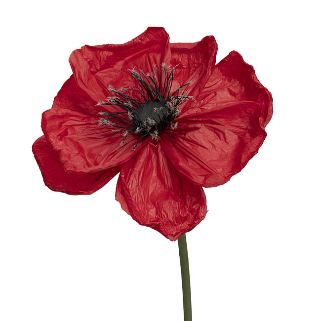 This striking giant poppy stem in vibrant red adds bold, whimsical beauty to any display. Standing 115cm tall with a generous 25cm flower head, it features delicate tissue-paper petals supported by underwire, allowing you to shape and style them as desired. Please note, the flower is very fragile and should be handled with care. It is not waterproof and not recommended for outdoor use, making it best suited for indoor décor, events, and eye-catching installations.