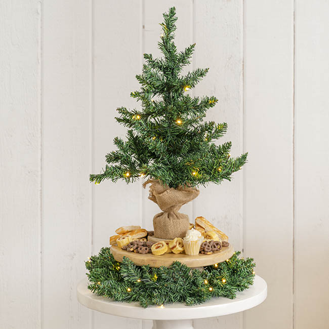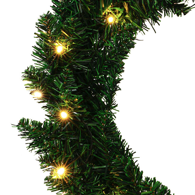 This wreath measures 50cm in diameter and has an inner diameter of approximately 30cm. It has 120 tips. It is sold individually. This wreath has warm white LED lights, which require 3 x AA batteries, which are not included.