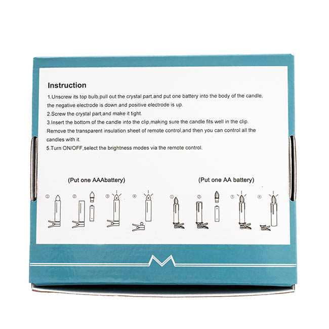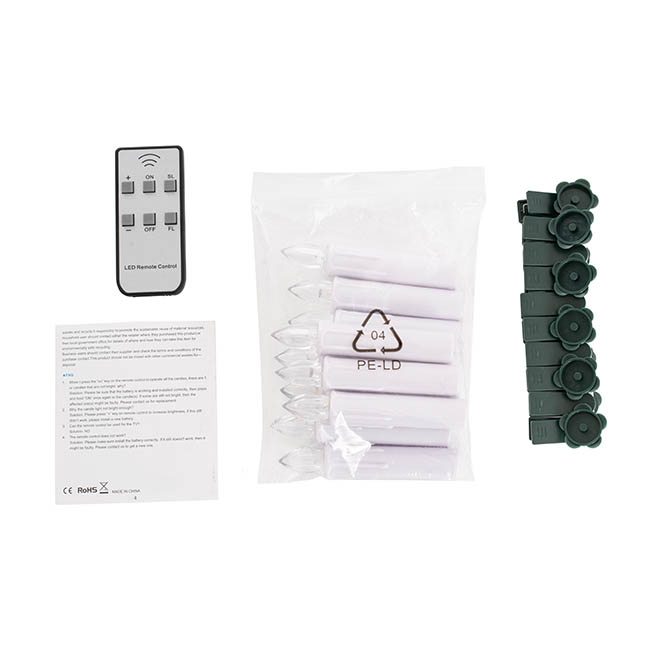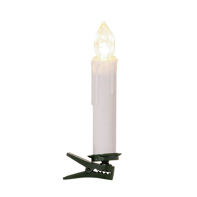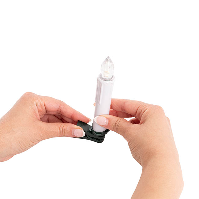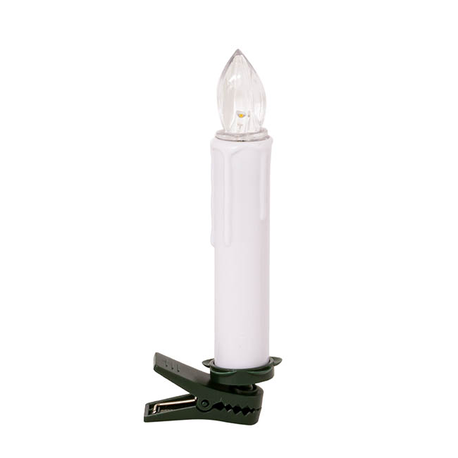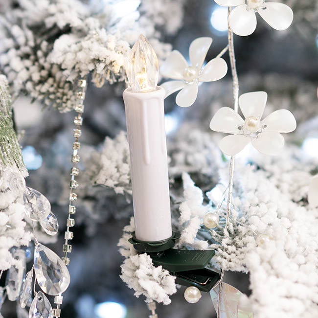 Each candle comes with a clip attached at the bottom, for easy attachment to a Christmas tree, tablescape, mantlepiece arrangement, and more. Each candle is powered by a single AA battery and controlled by a remote control.