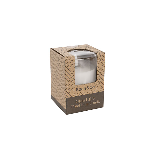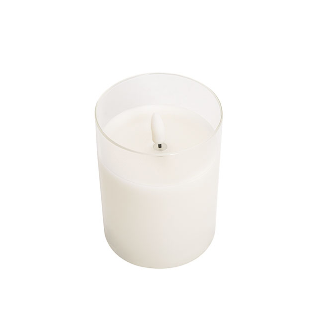 Be mesmerised by the magic of LED event candles. This Glass Trueflame™ Flickering LED White pillar candle gives a cosy ambiance like a real candle. It is a safe alternative to decorate your home, weddings and any special events. Featuring a glass holder filled with real wax, long battery lighting life and a realistic flameless glow.