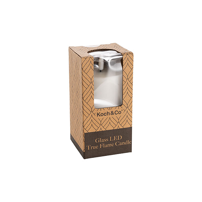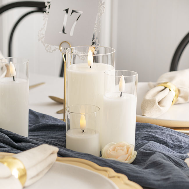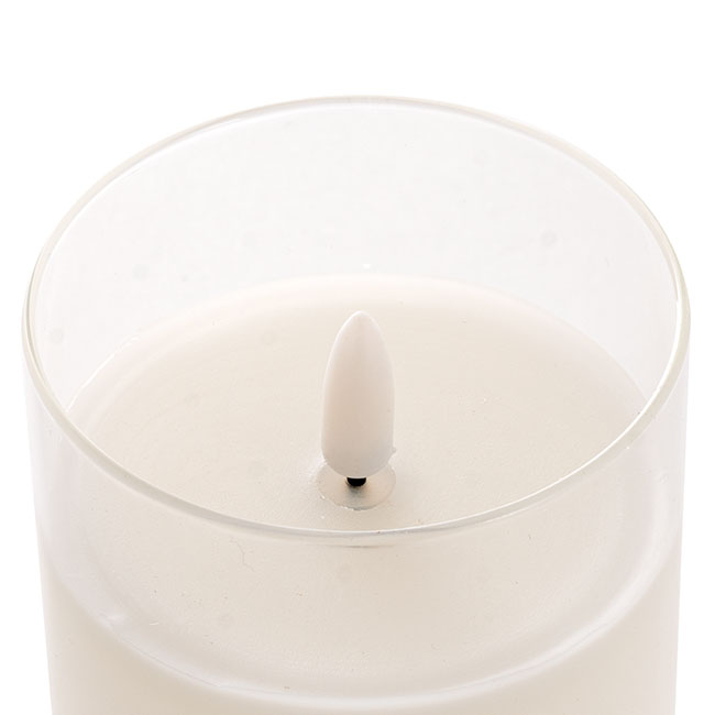 Be mesmerised by the magic of LED event candles. This Glass Trueflame™ Flickering LED White pillar candle gives a cosy ambiance like a real candle. It is a safe alternative to decorate your home, weddings and any special events. Featuring a glass holder filled with real wax, long battery lighting life and a realistic flameless glow.
