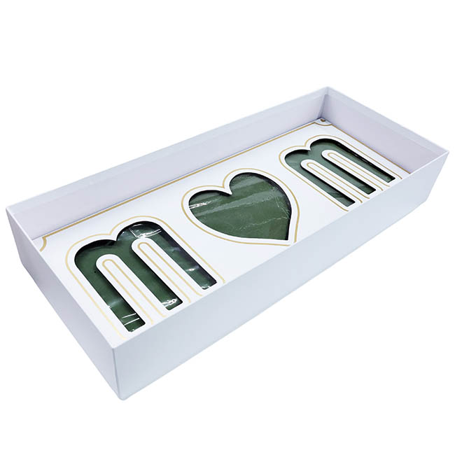 It features a white base, a white and gold cut-out insert, a white lid, and a clear tray with foam. The base holds a plastic tray with floral foam, topped with a cardboard insert featuring the white "M heart M" cut-out with gold decorative trim. The insert is adorned with a gold border for an extra touch of elegance.