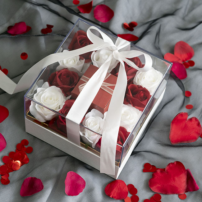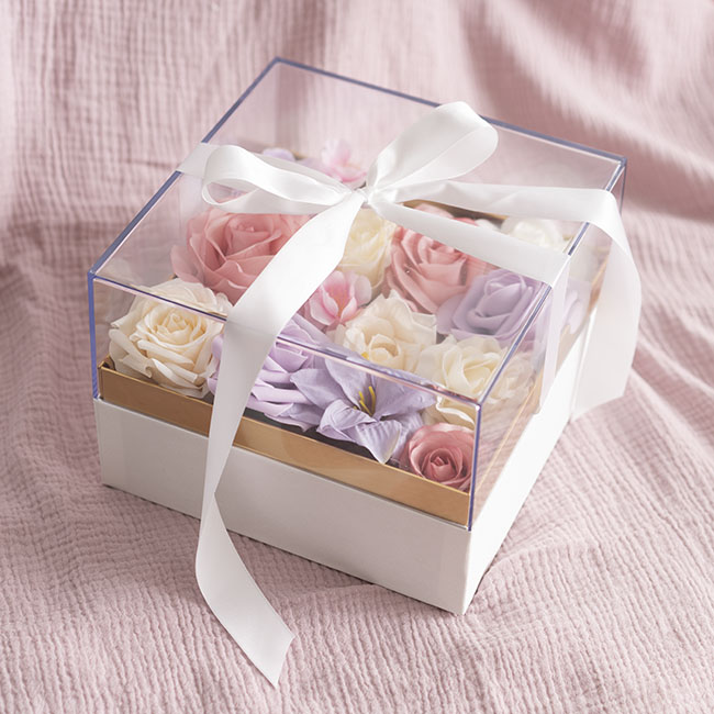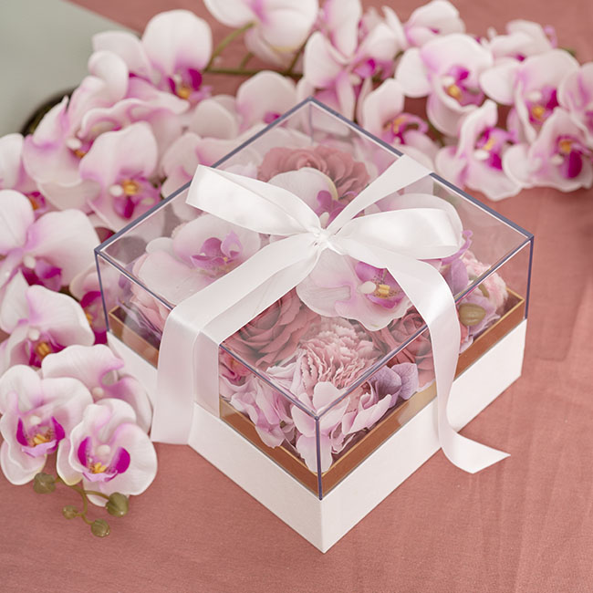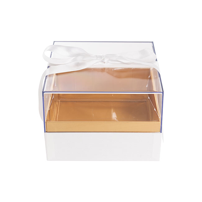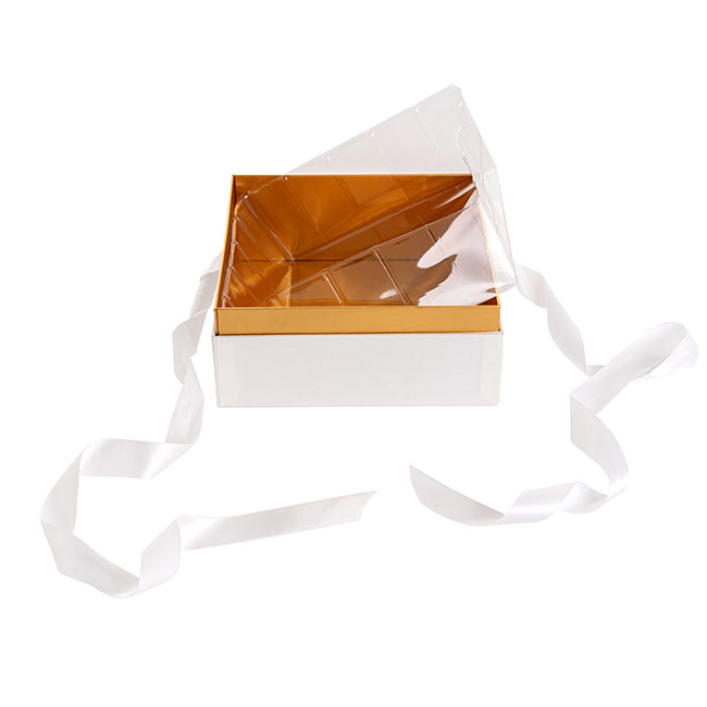This box has a removable clear acrylic lid, a removeable plastic liner, and the base is made of textured white cardboard with a matte gold 'inner box'. The matte gold finish covers the box interior base and sides. Please note, the white single-sided satin ribbon is embedded, and as such, cannot be removed.
