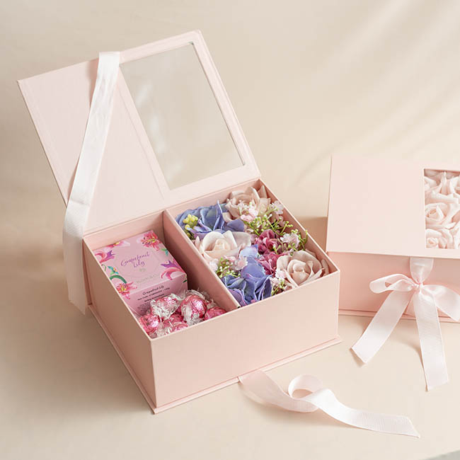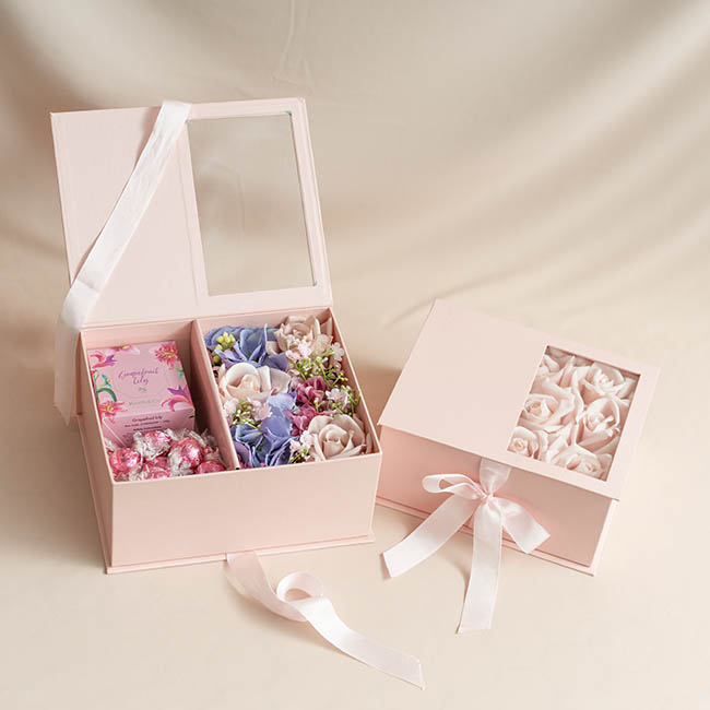 Each box includes a pink removable divider which can be used if you are wanting to split the box so you can have a section for flowers/food and gifts.