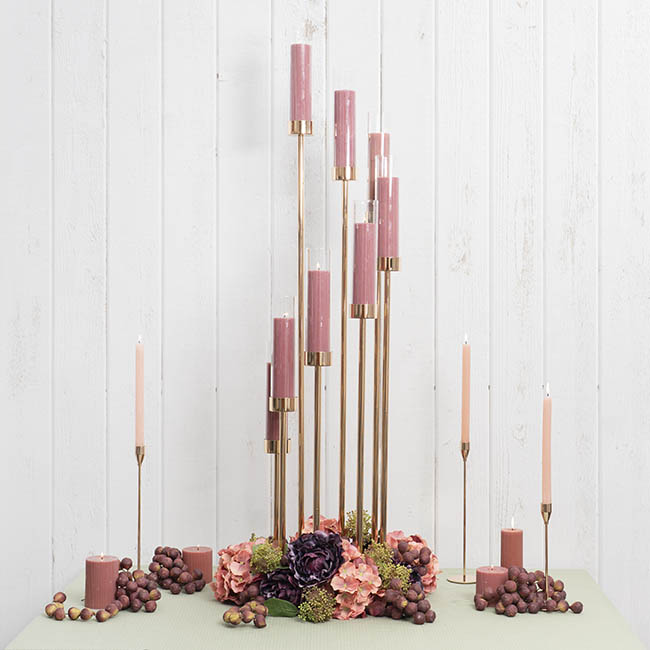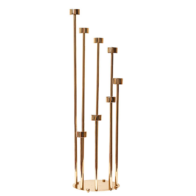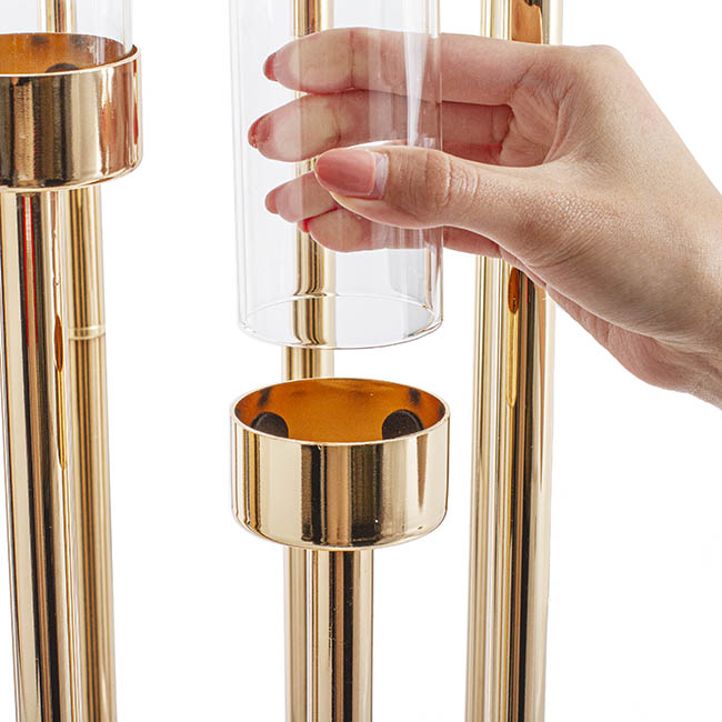 Standing 128cm tall with a sturdy 28cm diameter base, this product is sold individually and requires some assembly. Each of the eight hurricane glass holders measures 24.5cm high and 5.5cm in diameter. It is designed to accomodate candles up to 5cm in diameter.