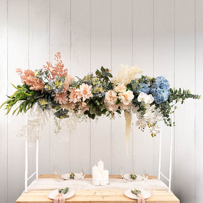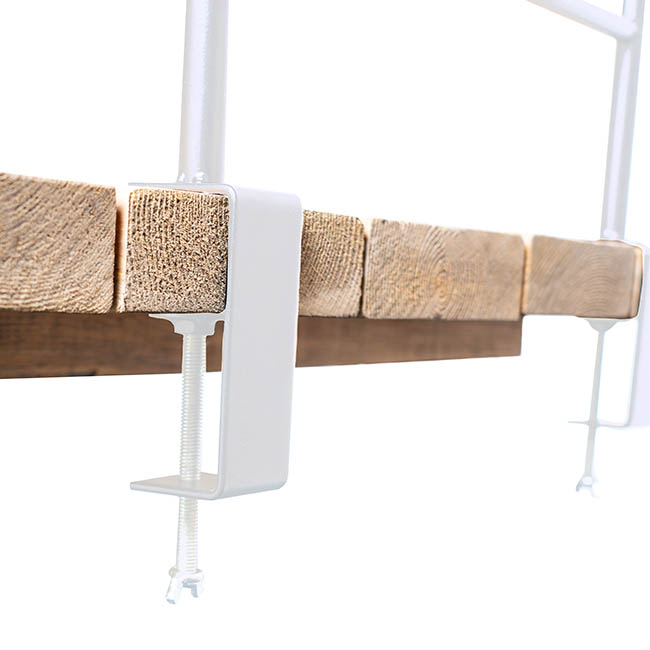 Create extravagant table scapes with the extendable clip on table frames. The table arch, made from white metal rods, clamps on to the ends of your table to create a sturdy structure. It includes a lattice panel on the top, that is 40.5cm wide and can be decorated with fresh and artificial flowers, ribbons and other decorative pieces to match your theme. Height can be adjusted. The maximum height stands 98cm and the minimum height stands 95cm above your table, providing ample room for draping and hanging decorations. The maximum width is 145cm and the minimum width is 125. Comes flat packed and is easy to assemble.