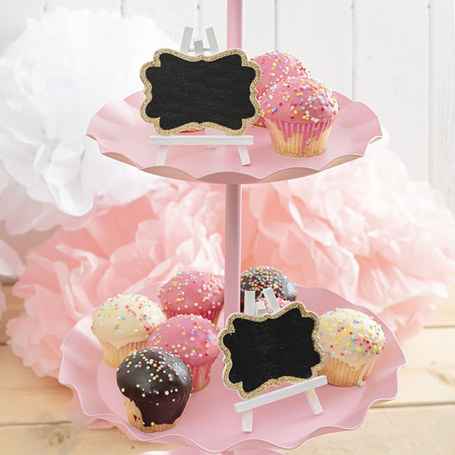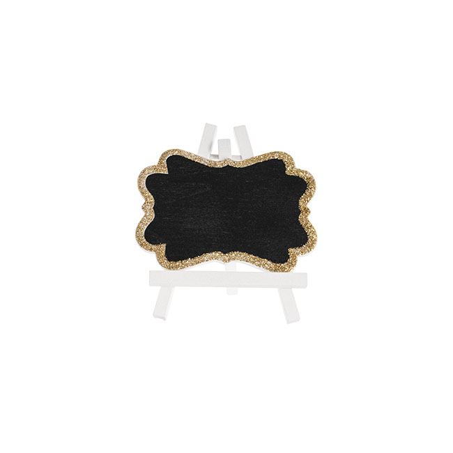 Each chalkboard features a gold-coloured scroll border and a three-legged easel with a hinged top. Measure 7cm wide x 8cm in height. Available in a pack of 6.