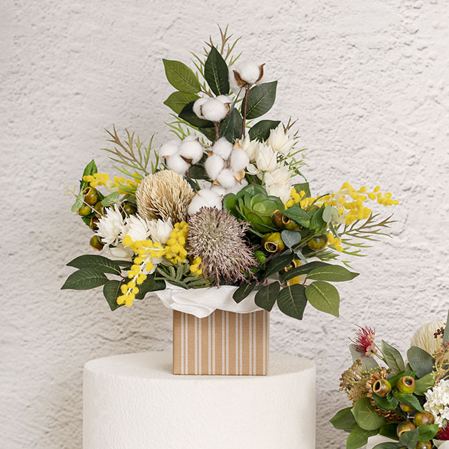 Our mini posy boxes are 13cm x 13cm x 12cm high. These boxes are not waterproof, so it is recommended to use in conjunction with our clear or coloured cello wrap. Use this posy box with a 1/3 or 1/2 foam brick. This product is sold as a pack of 25.