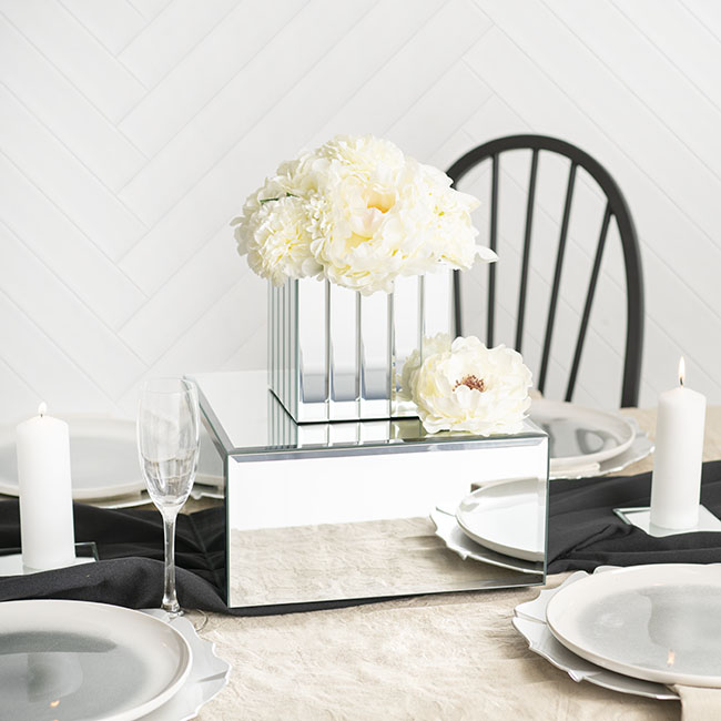 The interior of this vase is also covered in a glass mirror reflective surface and has a flocked bottom with foam pads on the corners. This vase is also available in two rectangle-shaped varieties.