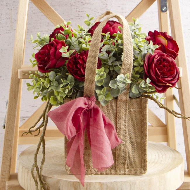 The jute bag is lined with plastic for extra protection and is waterproof. These bags are perfect for fresh floral arrangements or hampers and gifts. Sold as an individual bag.
