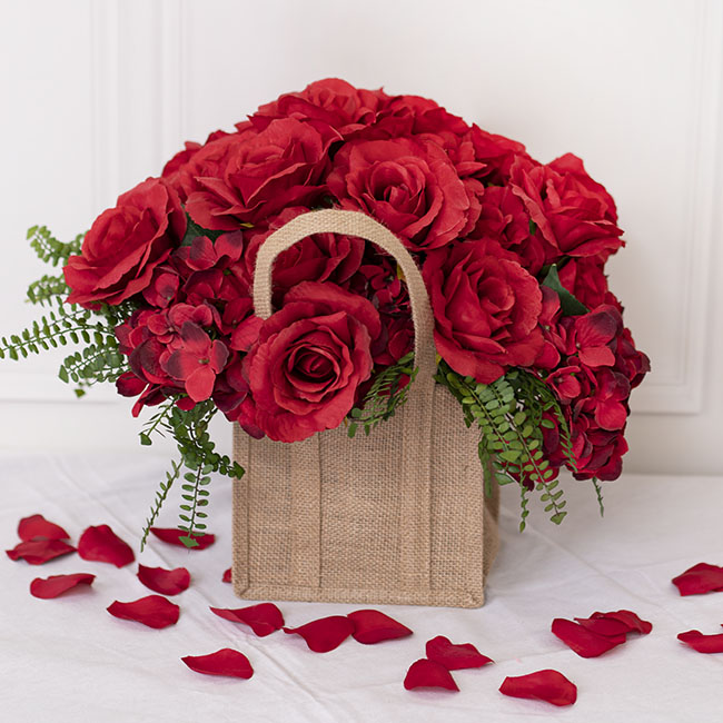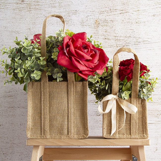 The jute bag is lined with plastic for extra protection and is waterproof. These bags are perfect for fresh floral arrangements or hampers and gifts. Sold as an individual bag.