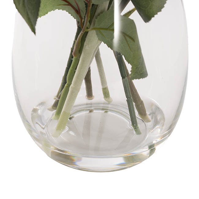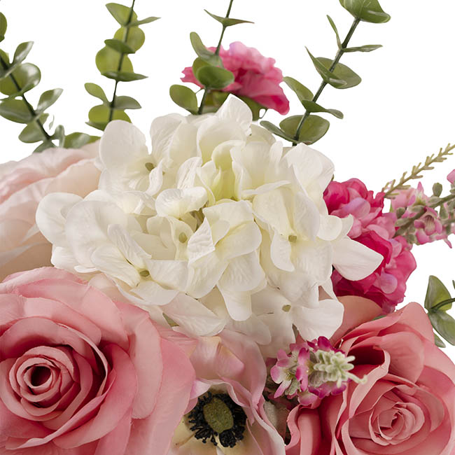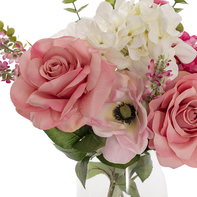 The Nicole flower arrangement is a vibrant blend of 10 stems featuring roses, hydrangea, zinnias, poppies, and eucalyptus leaves for a fresh, garden-inspired look. Set in a glass vase and secured with clear resin acrylic water, it offers a lifelike, long-lasting finish. The vase stands 18cm tall, 14cm wide, with an 11cm top diameter—perfect for brightening up any tabletop or shelf. Some light styling is needed after unboxing to bring the arrangement to life.