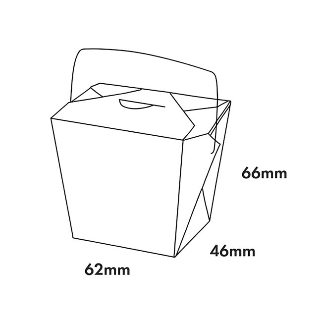 Our Noodle Takeawy boxes are perfect for small takeaway foods or lolly/favour boxes. They are a traditional design with tuck in lid and wire handle for carrying. Made from 250gsm food grade ivory board, they come pre-assembled and ready for use. Holds approximately 470ml of food. The box is tapered and the base measures 7.5cm x 5.5cm and the top is 9.4cm x 7.5cm. Height is 8.5cm. With the handle, the height is 13cm. Sold as Pack 4.