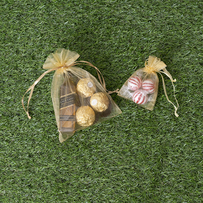 Organza bags make it easy to see the sweet treats inside and while almonds are traditionally used for weddings, these are also ideal for chocolates, lollies and personalised candy. This beautiful gold organza bag has a satin ribbon drawstring close and measures 12.5x17cmH. Fill area is 12.5cmx13cm. They are also ideal for storing or gifting jewellery and other small gifts.