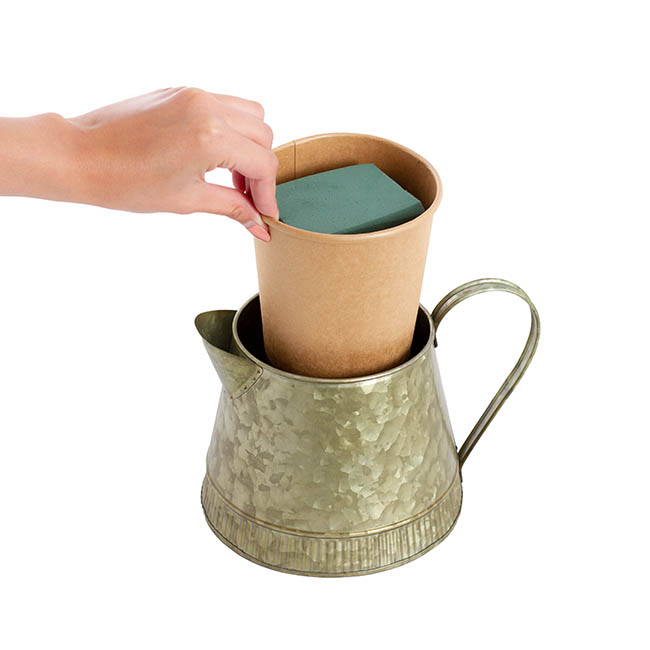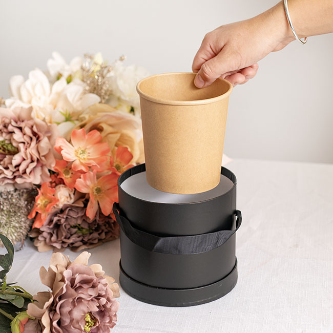 Paper takeaway container will hold about one third of a floral foam brick. This eco-friendly container is waterproof and it sits perfectly inside a mini box and other non-water resistant planters. 11.5cm diameter x 12cm high. It's also food safe. Please note this product is sold as a single item. The plastic container featured in the fourth image is not sold with the product. The floral foam featured in the fifth image is also not sold with this product.