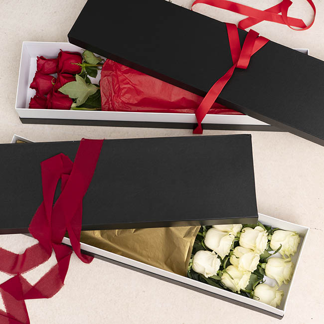 These rose boxes are the perfect size for up to a dozen (12) long stem roses. In addition to the roses, there is enough room to also include a small box of chocolates, jewellery box, bottle of wine, or teddy bear.