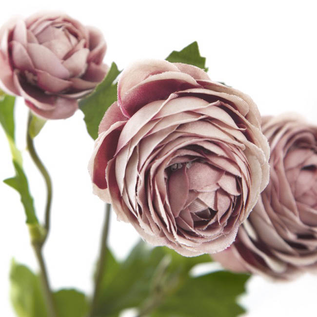 Our Petite Ranunculus Spray in Dusty Rose has three ruffle-petalled flower heads.