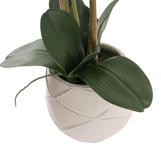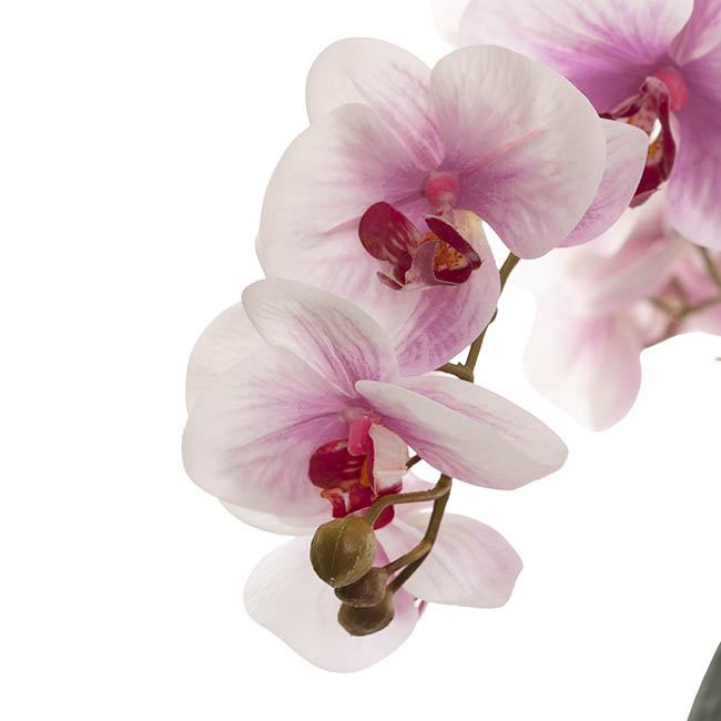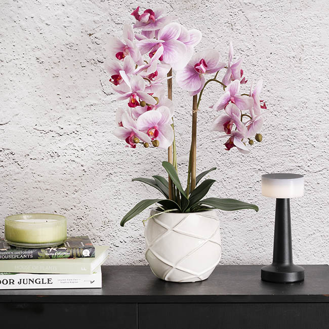 Enhance your space with this stunning potted orchid, featuring three vibrant real-touch fuchsia orchids nestled in a sleek, round white ceramic pot. The leaves are designed with a wire backing for easy adjustment, allowing you to shape them for a more natural look. Once unpacked, the arrangement can be styled to your liking, and for an even more realistic finish, consider using Koch & Co's leaf shine spray to give the leaves a fresh, glossy appearance. This elegant piece brings a touch of nature indoors with minimal maintenance.