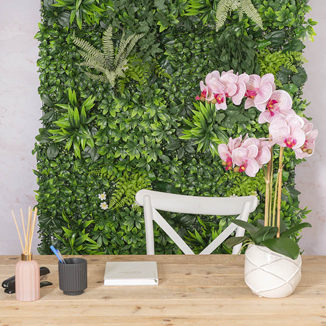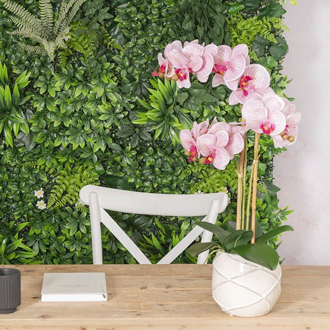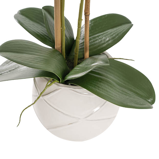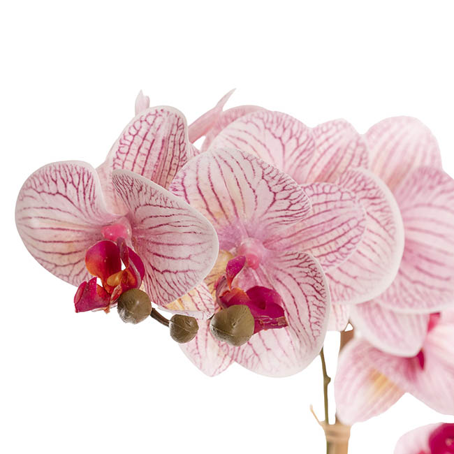 Enhance your space with this stunning potted orchid, featuring three vibrant real-touch hot pink orchids nestled in a sleek, round white ceramic pot. The leaves are designed with a wire backing for easy adjustment, allowing you to shape them for a more natural look. Once unpacked, the arrangement can be styled to your liking, and for an even more realistic finish, consider using Koch & Co's leaf shine spray to give the leaves a fresh, glossy appearance. This elegant piece brings a touch of nature indoors with minimal maintenance.