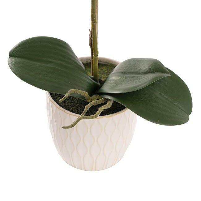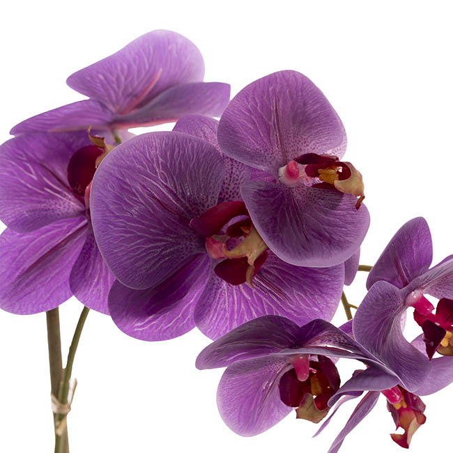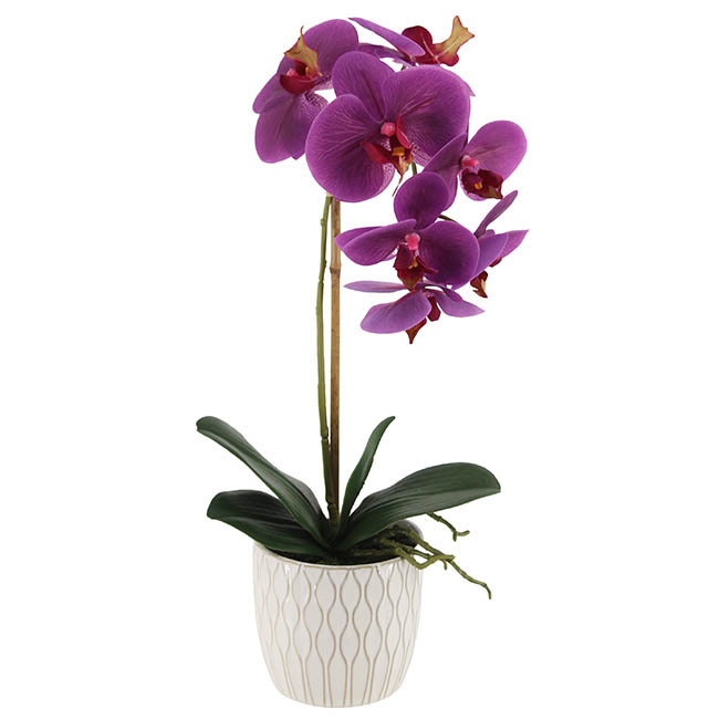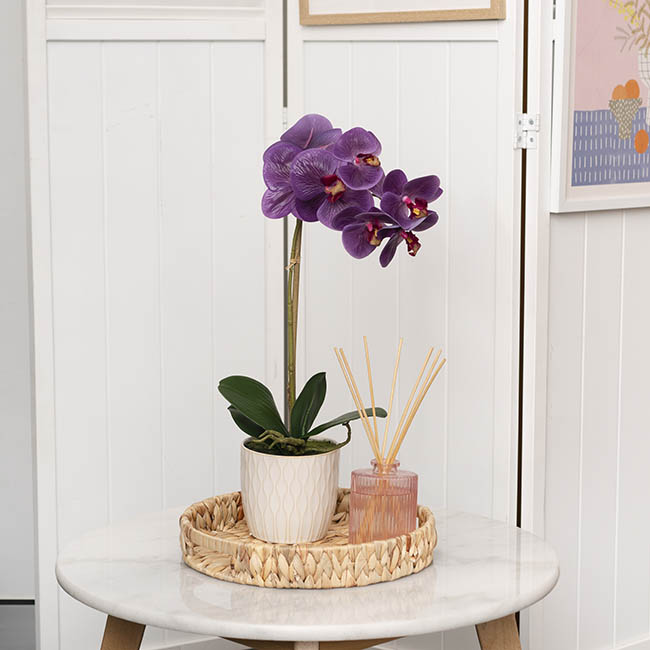 Add a touch of elegance to any room with this beautiful potted orchid, featuring a single-stem real-touch orchid in a striking purple hue set in a round, cream ceramic pot. The orchid's leaves are designed with a wire backing, allowing for easy shaping to create a more natural look. Upon unpacking, the arrangement can be styled to your preference, and for an extra realistic touch, you can use Koch & Co's leaf shine spray to give the leaves a glossy, fresh appearance. Perfect for brightening up your home with minimal upkeep.