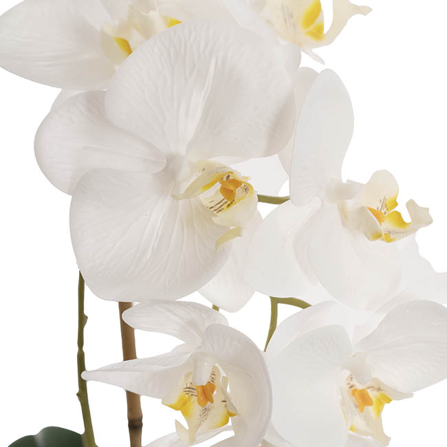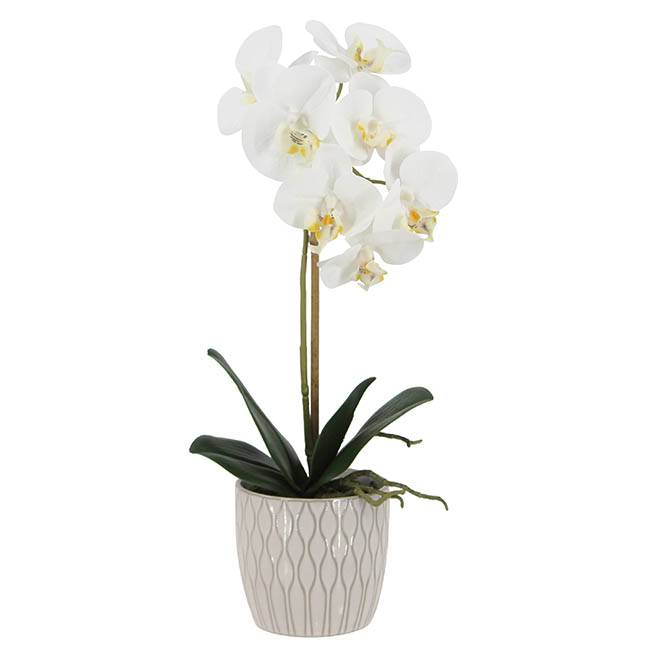 Add a touch of elegance to any room with this beautiful potted orchid, featuring a single stem real-touch white orchid set in a clean, round cream ceramic pot. The orchid's leaves are designed with a wire backing, allowing for easy shaping to create a more natural look. Upon unpacking, the arrangement can be styled to your preference, and for an extra realistic touch, you can use Koch & Co's leaf shine spray to give the leaves a glossy, fresh appearance. Perfect for brightening up your home with minimal upkeep.