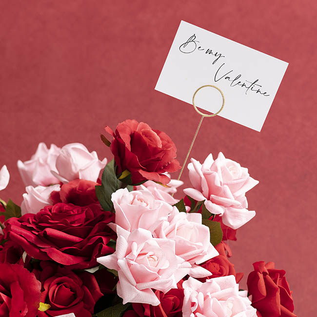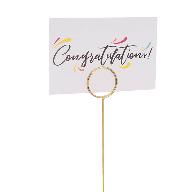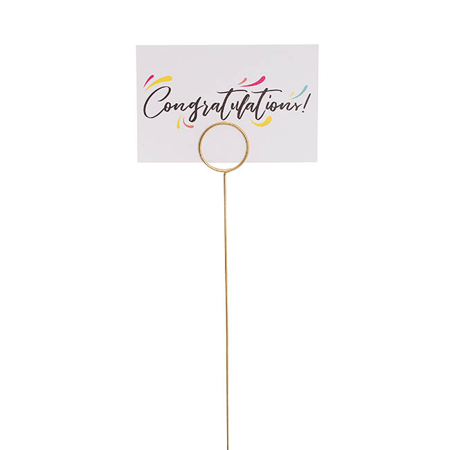 These Metal Card Holder Picks feature a Gold Oval shape at the top. Made up of two oval layers of metal, to use, simply slide a florist enclosure card or price tag between the ovals. These delightful picks will make a statement and bring an elegant look to any floral arrangement or display. Available in a pack of 10, the oval measures 2.8cm wide and sits on a 31cm long metal stem. The overall height of this stem measures 34cm.
